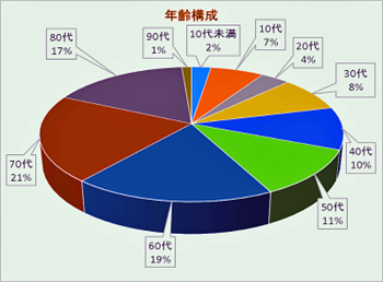 円グラフから読み取れますが、日の出町会は年配の方が多く、50代・60代は高い年齢ではなく、中間に位置しています。